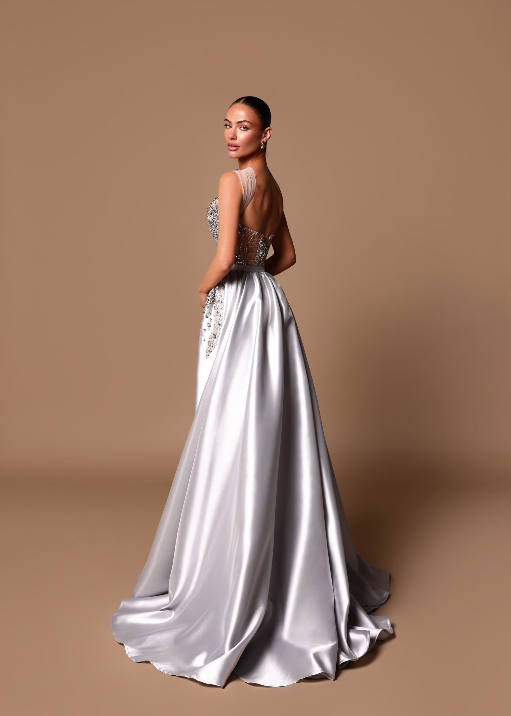 This is an elegant grey embellished gown with intricate detailing and a dramatic silhouette. The gown features sheer fabric adorned with elaborate beading and sequins, creating a stunning visual effect. It has a sleek, form-fitting design with a flowing train, exuding sophistication and glamour.