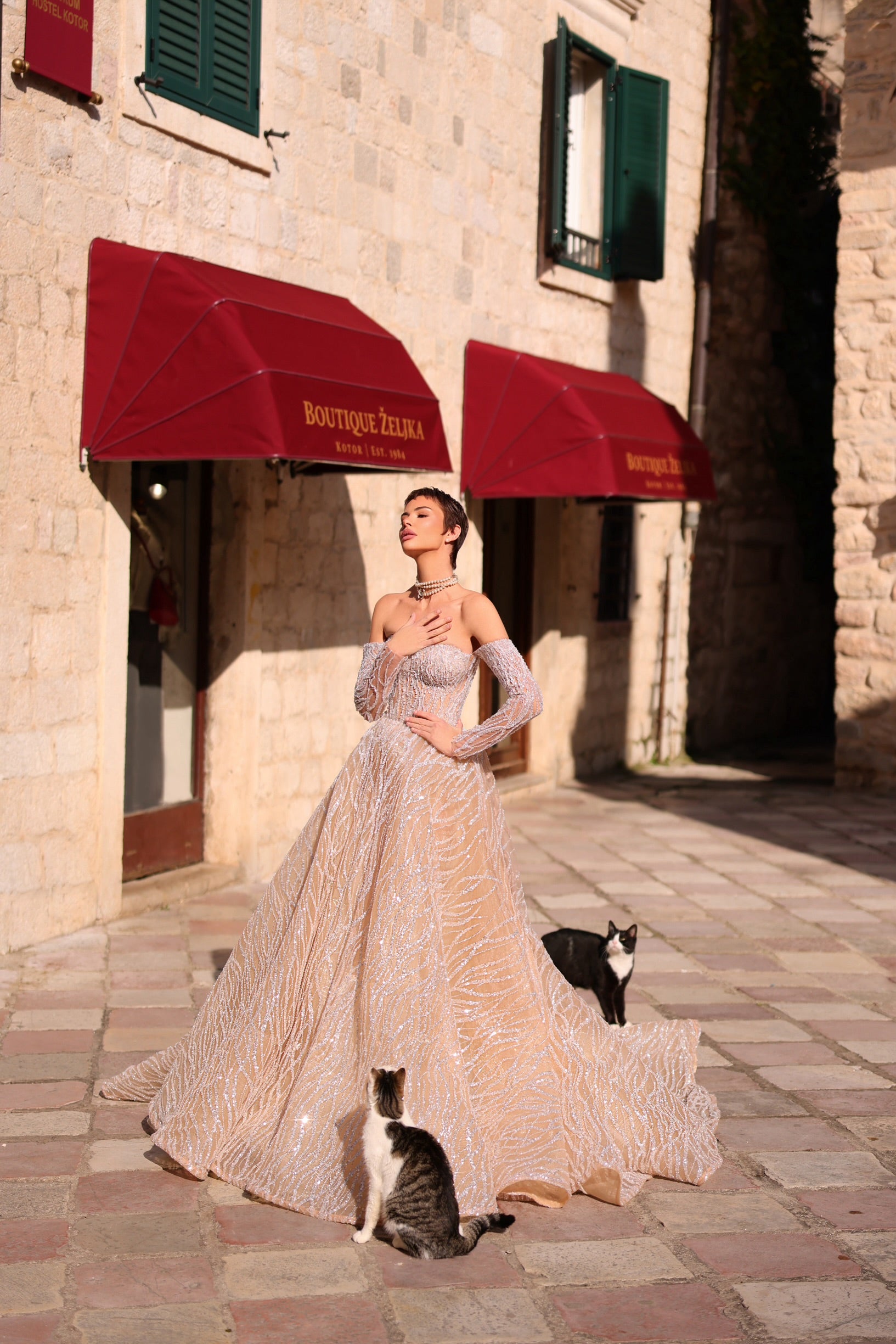 Step into a fairytale with the Anna Wedding Gown, a true masterpiece of opulence and elegance. Designed for the bride who wants to shine, this breathtaking ball gown features a fully beaded corset, adorned with intricate hand-sewn embellishments that catch the light from every angle. The voluminous skirt cascades in layers of luminous fabric, creating a regal and enchanting silhouette.Completing the look, Anna comes with matching beaded gloves, adding an extra touch of glamour and sophistication. Perfect for a grand entrance, this gown is made for the bride who dreams of a dazzling, unforgettable wedding day.