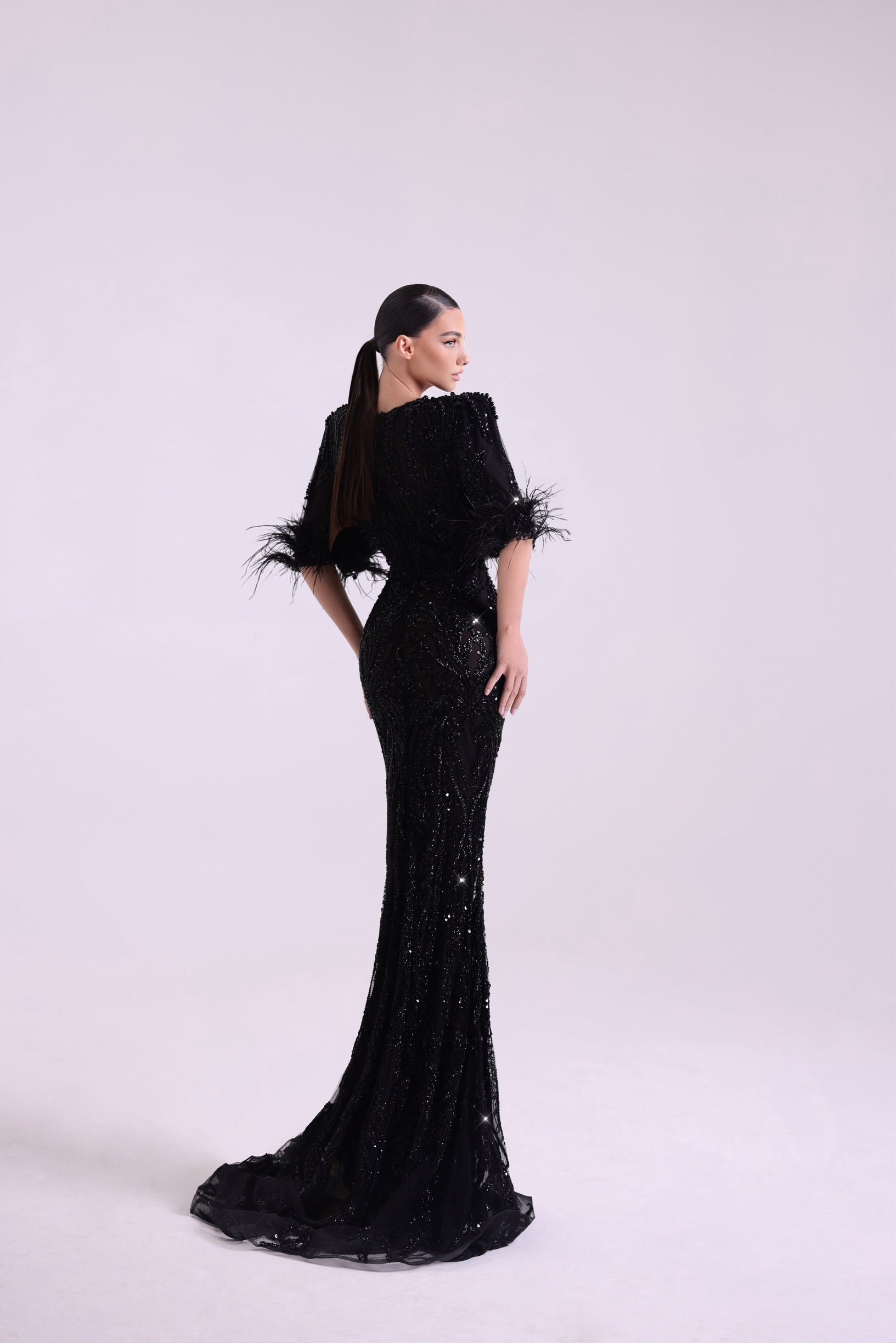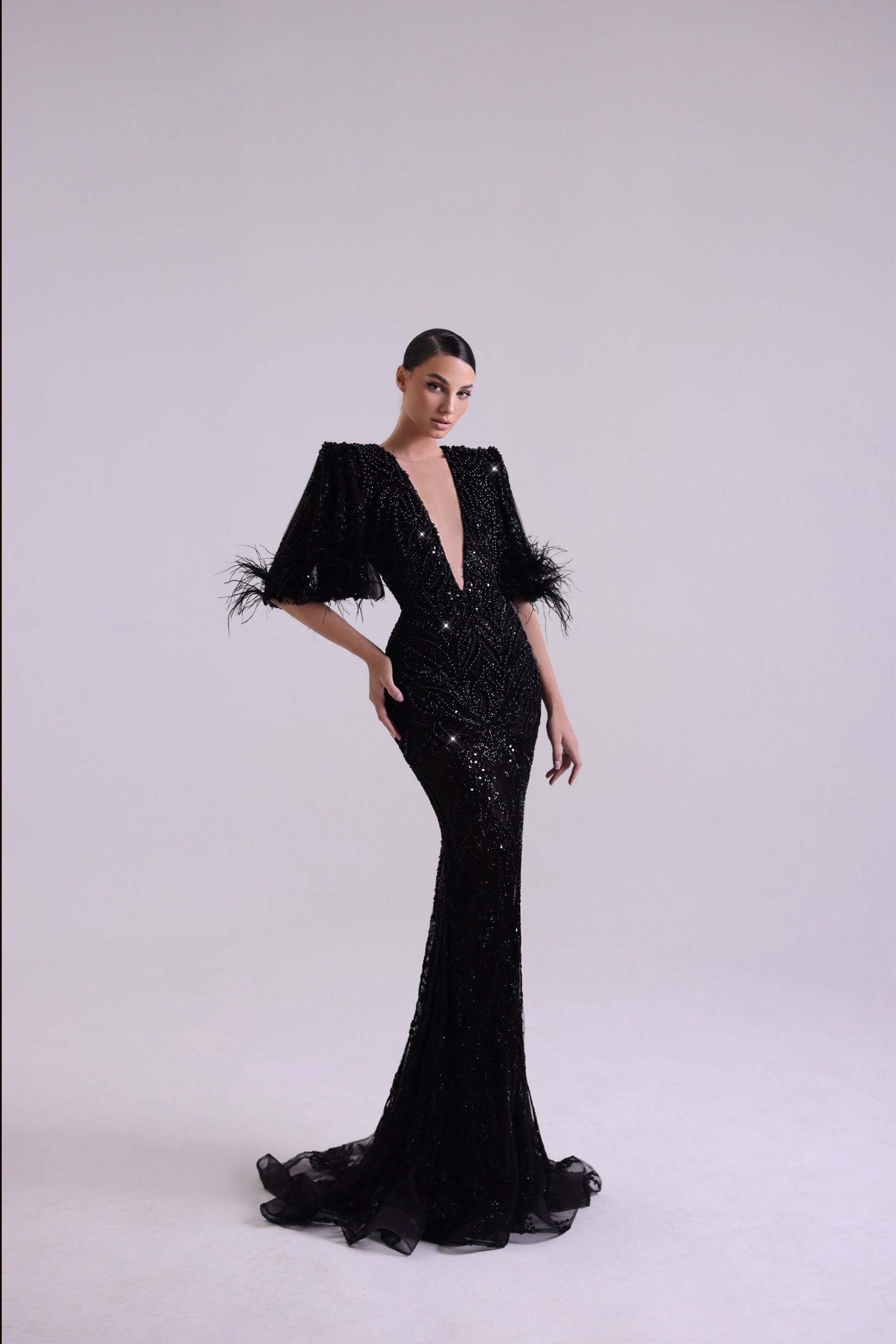 This black mermaid dress features short sleeves with black feathers and is embroidered with handmade black pearls. The deep V-neckline and figure-hugging silhouette add a sophisticated, glamorous touch, making it perfect for any special occasion.