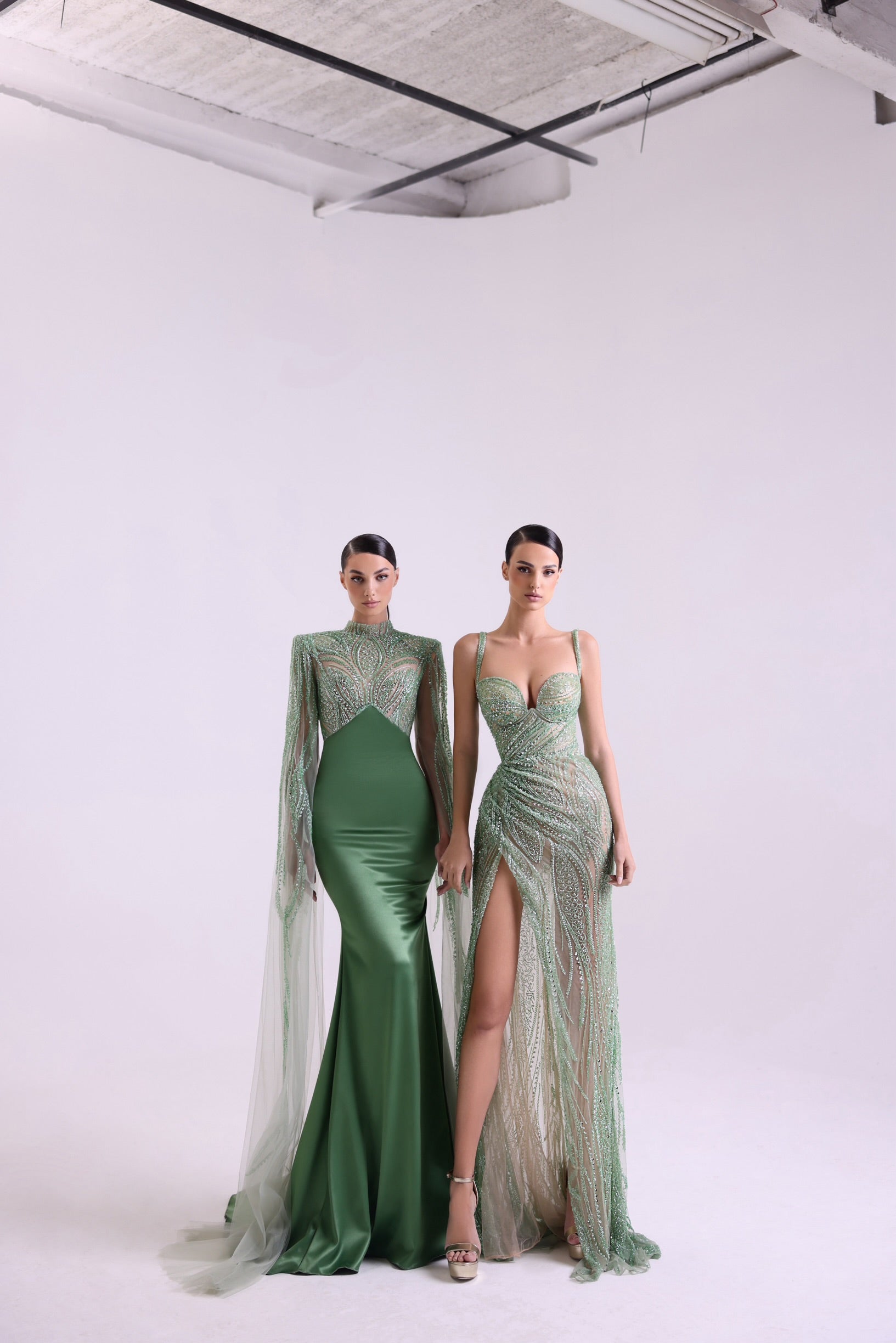 This soft green mermaid gown features long sleeves crafted from delicate tulle, adding an ethereal touch to the high-neck design. The all-covered silhouette hugs the body, gracefully flaring out at the hem for a sophisticated and elegant look. Perfect for making a refined statement.