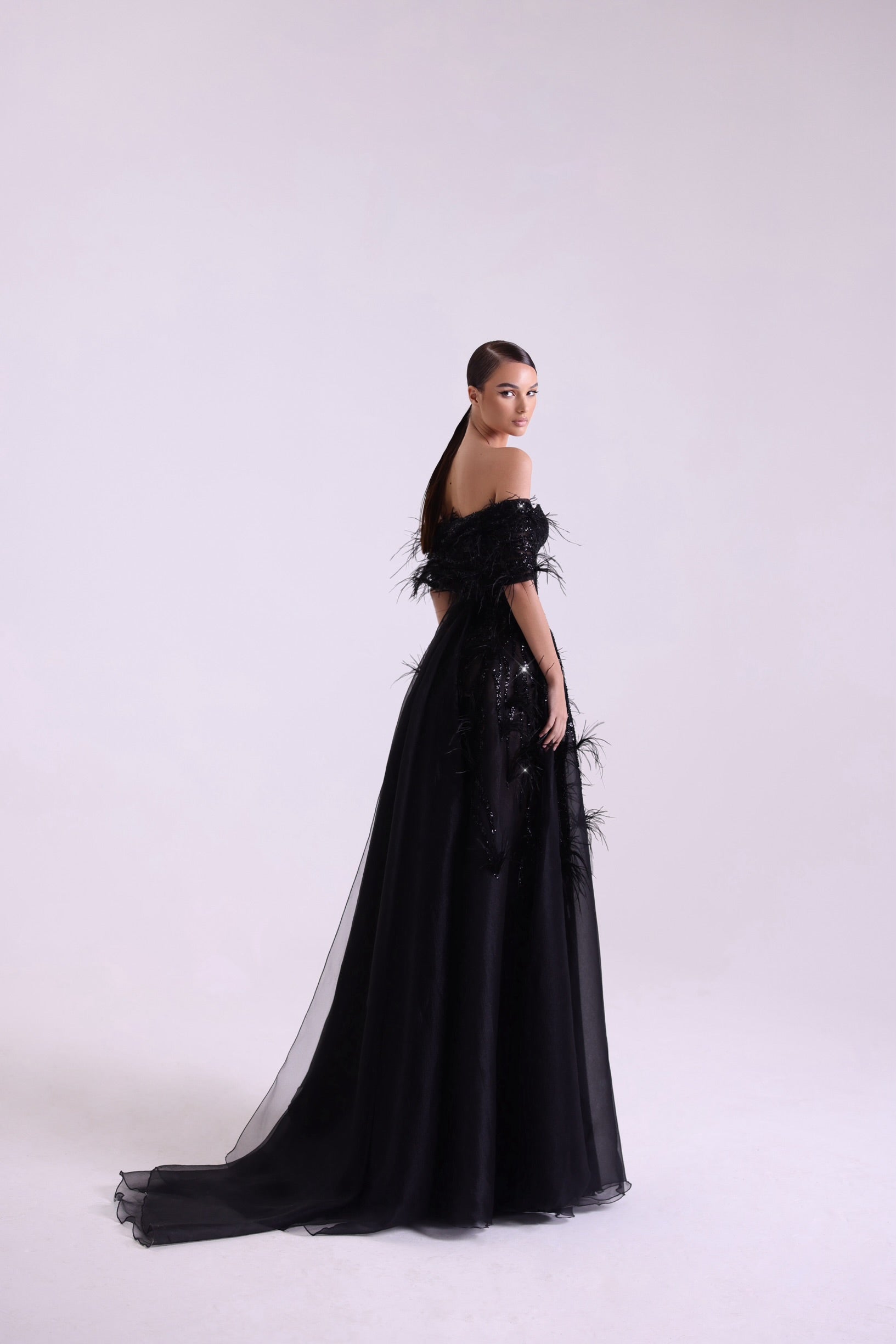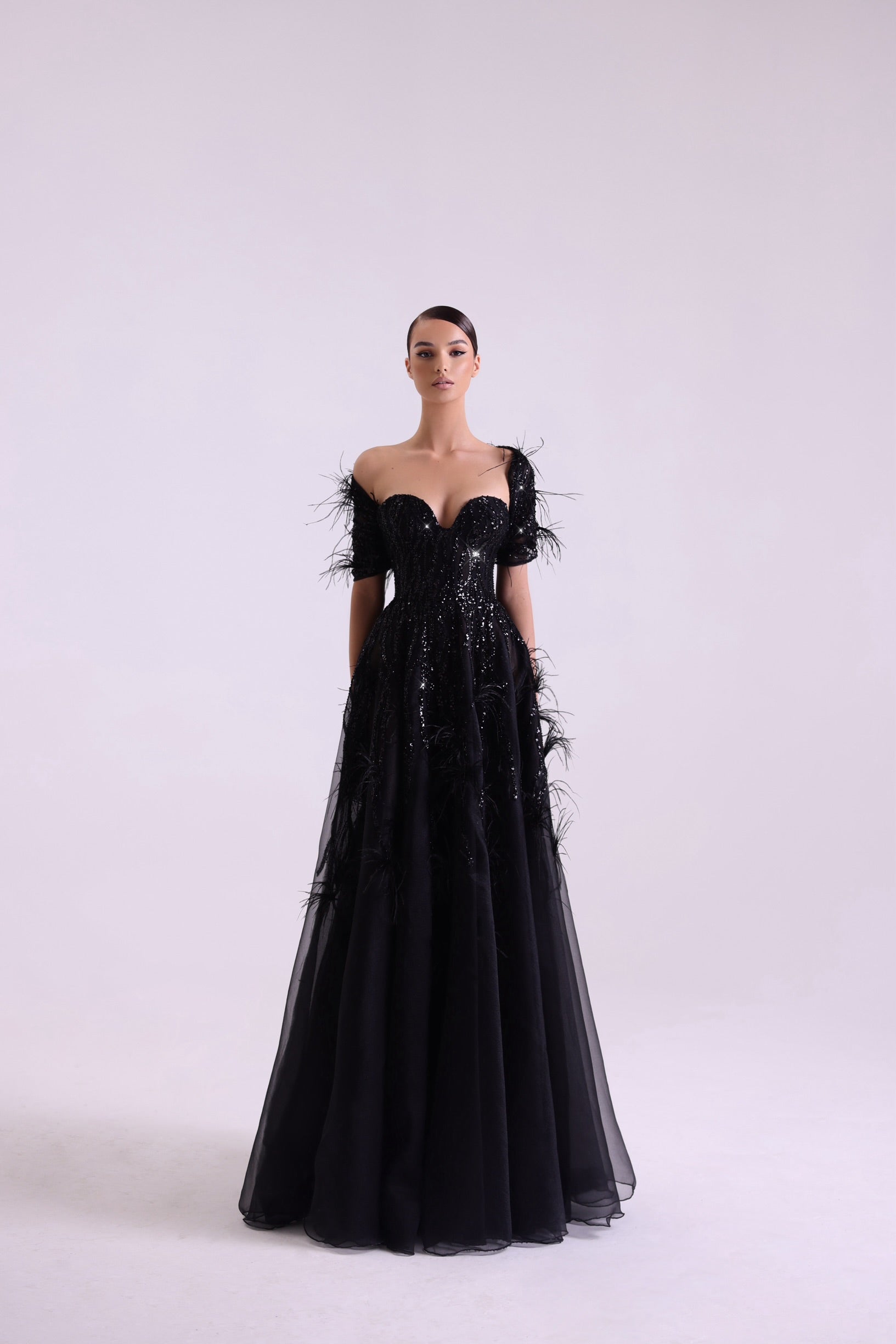 This black heart-shaped corset dress features a flattering organza skirt with intricate embroidery that flows from the corset through to the skirt. A detachable cape with feathers and hand-made embroidery adds a dramatic, elegant touch.