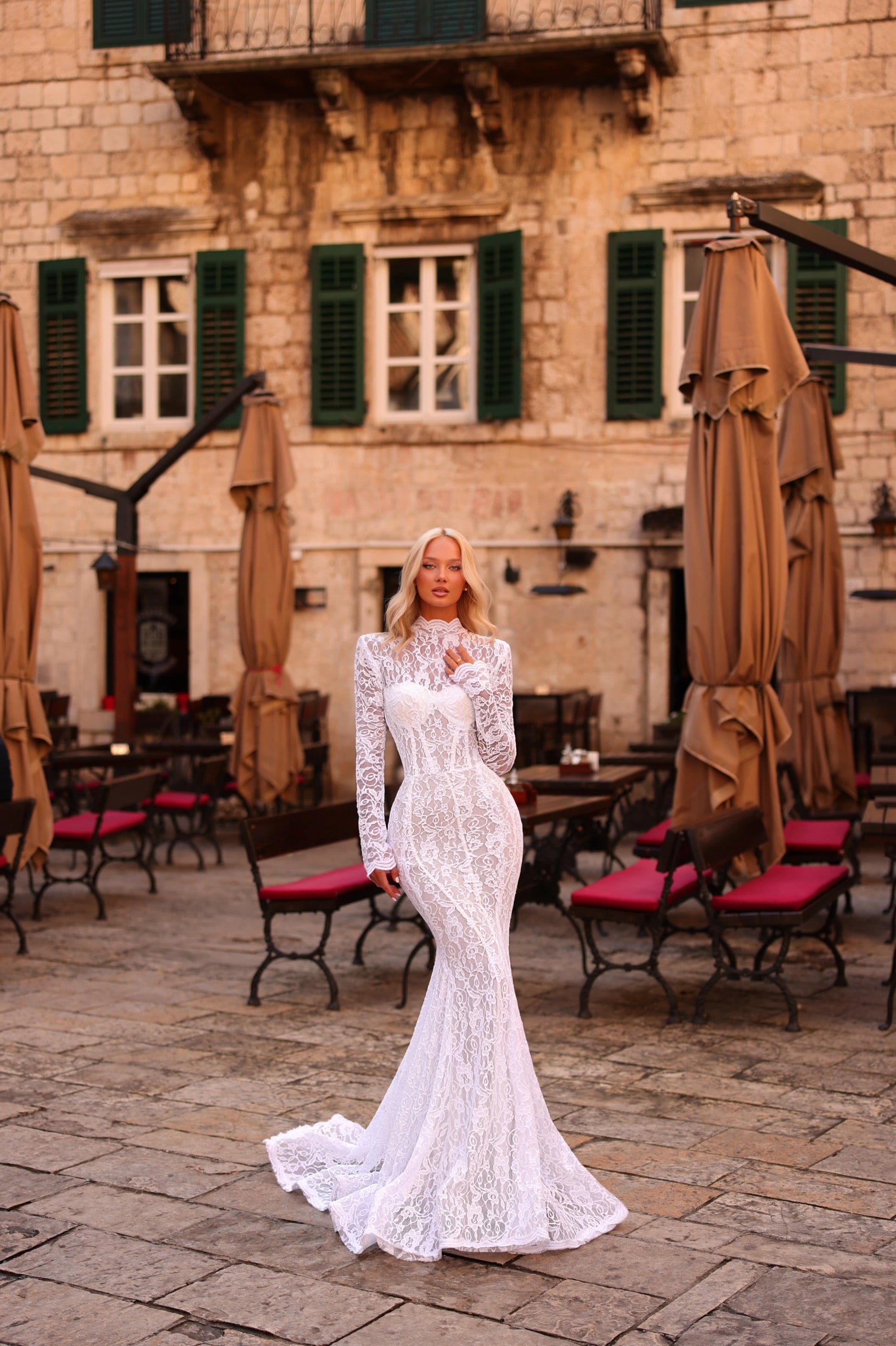 Elevate your bridal elegance with the Emmelie wedding dress, a stunning blend of classic romance and modern sophistication. This exquisite gown features a figure-hugging silhouette crafted from delicate lace, accentuating your curves with grace. The high neckline and long sleeves add a touch of timeless elegance, while the intricate detailing.