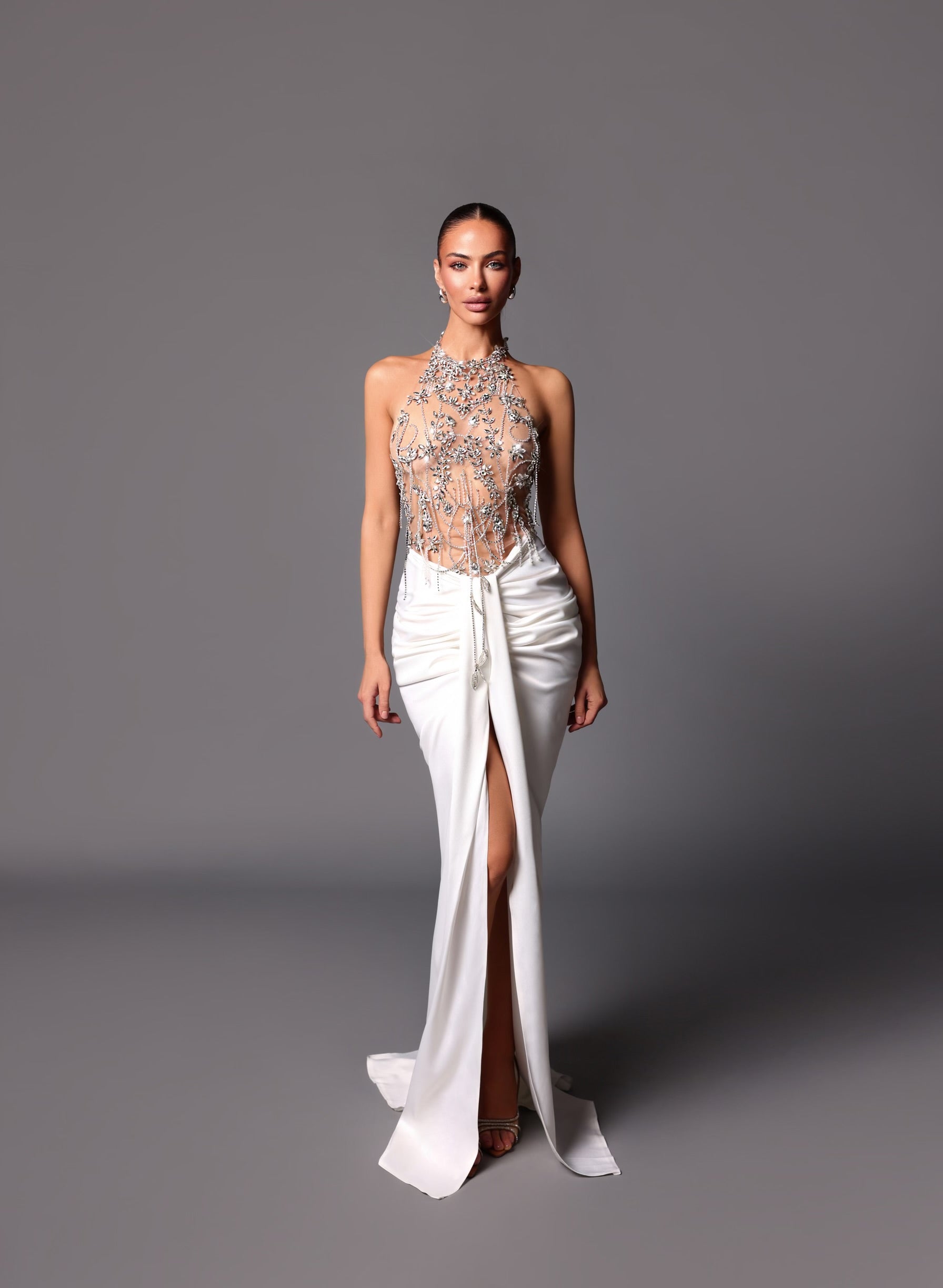 A sophisticated white dress with a high neckline, sheer beaded bodice, and draped skirt with a front slit.