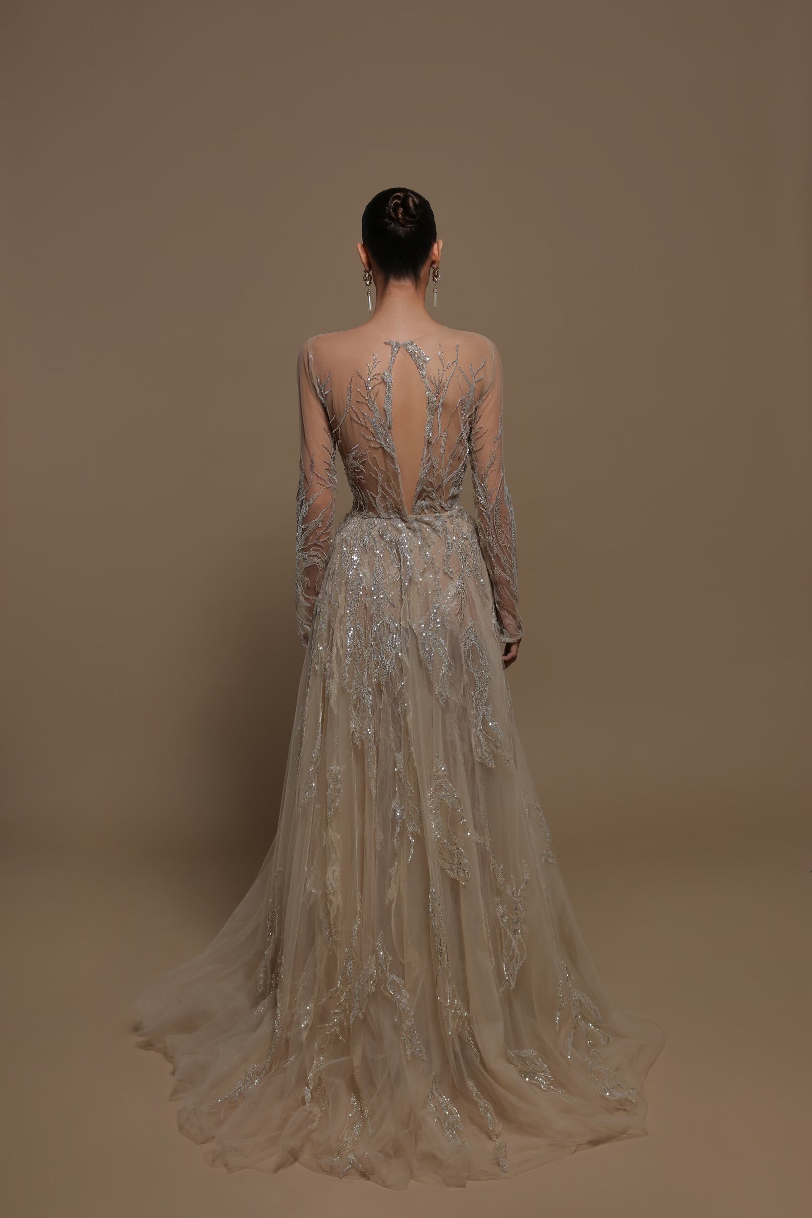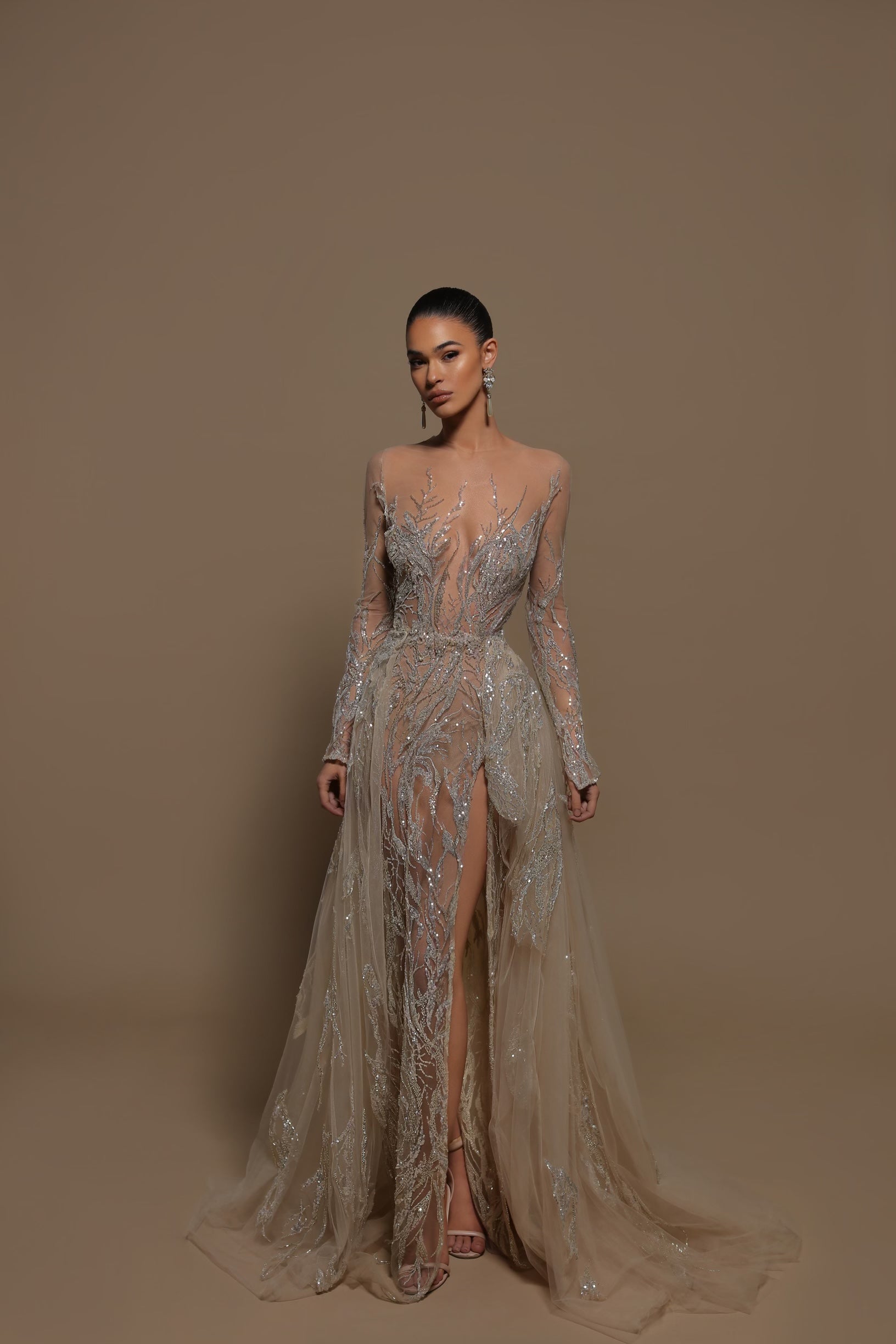 Embellished dress with long sleeve, open back and slit.