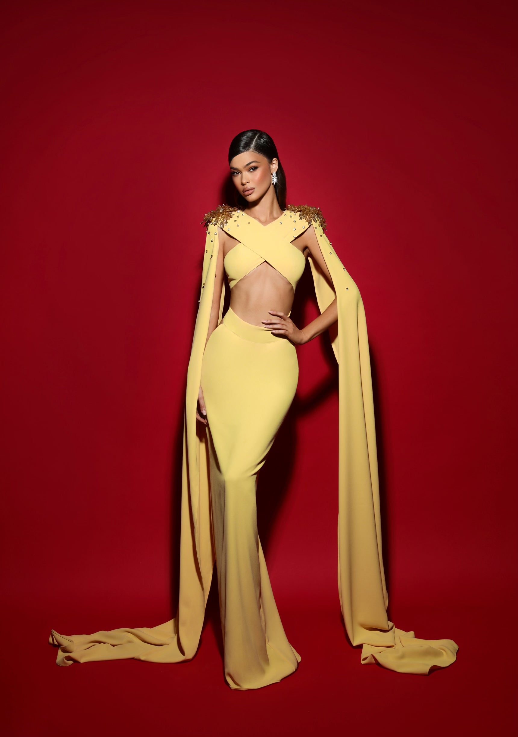 Georgette crepe dress in yellow with long sleeve, open abdomen and details on shoulder.