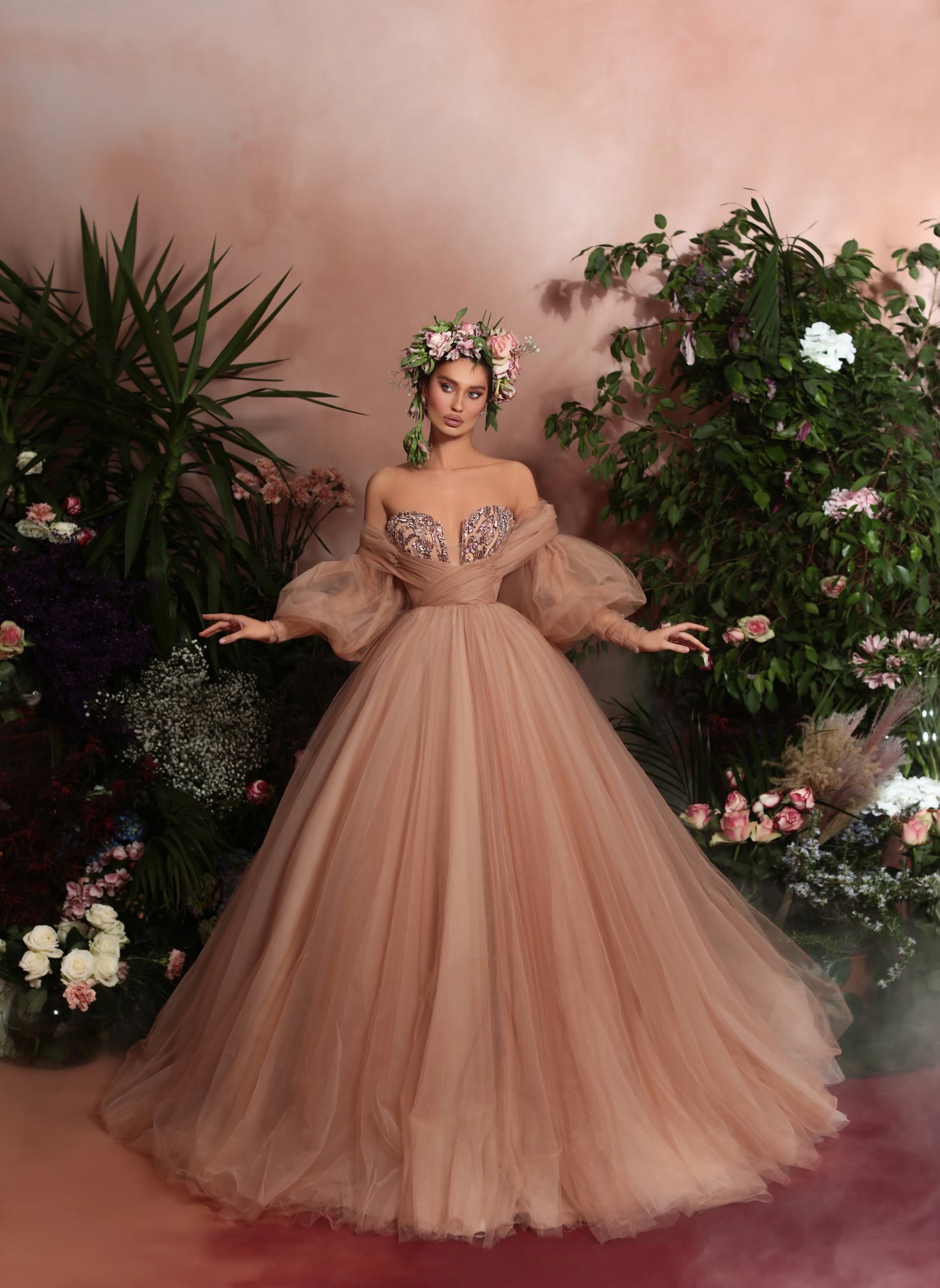 Nude tulle ball dress with fluffy sleeves and handmade beaded details on corset.