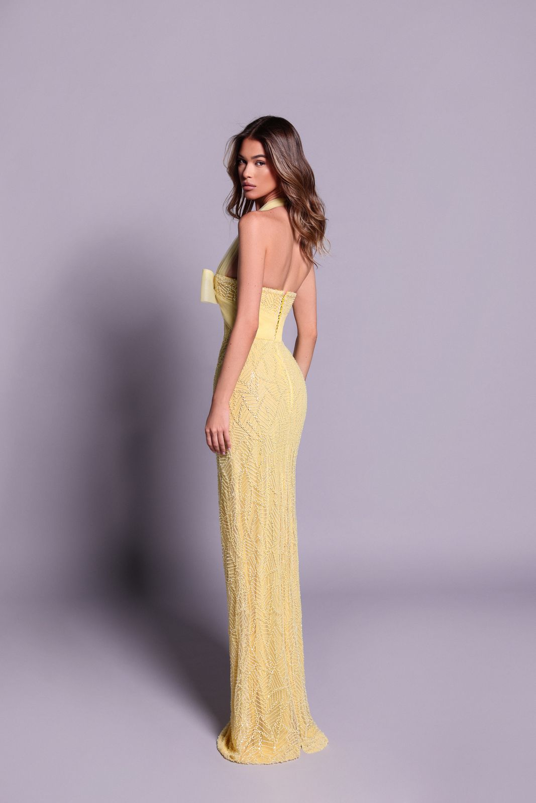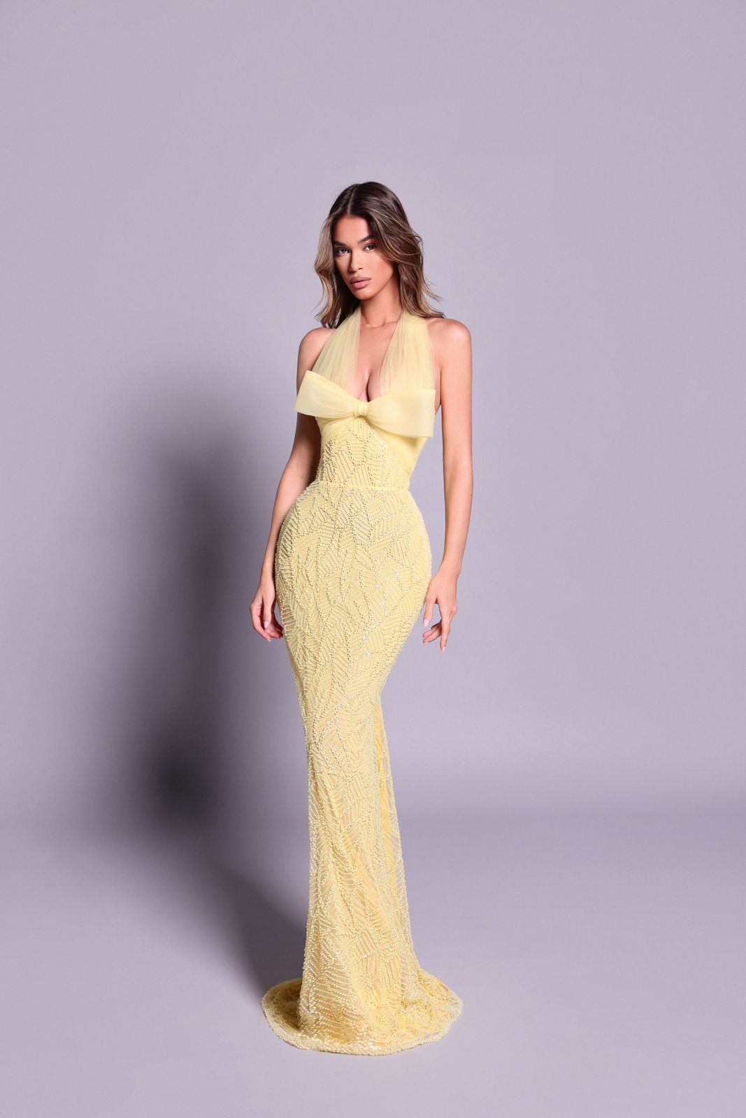 Radiant and unforgettable, the Solaré gown captures the warmth and brilliance of golden sunlight. Designed with a sleek, figure-sculpting silhouette, this floor-length dress is adorned with luminous sequins that shimmer with every movement. The plunging halter neckline and delicate draping at the bust add a touch of romantic allure, making Solaré a stunning choice for summer soirées, formal evenings, or statement red carpet moments. Step into the spotlight with this golden masterpiece.