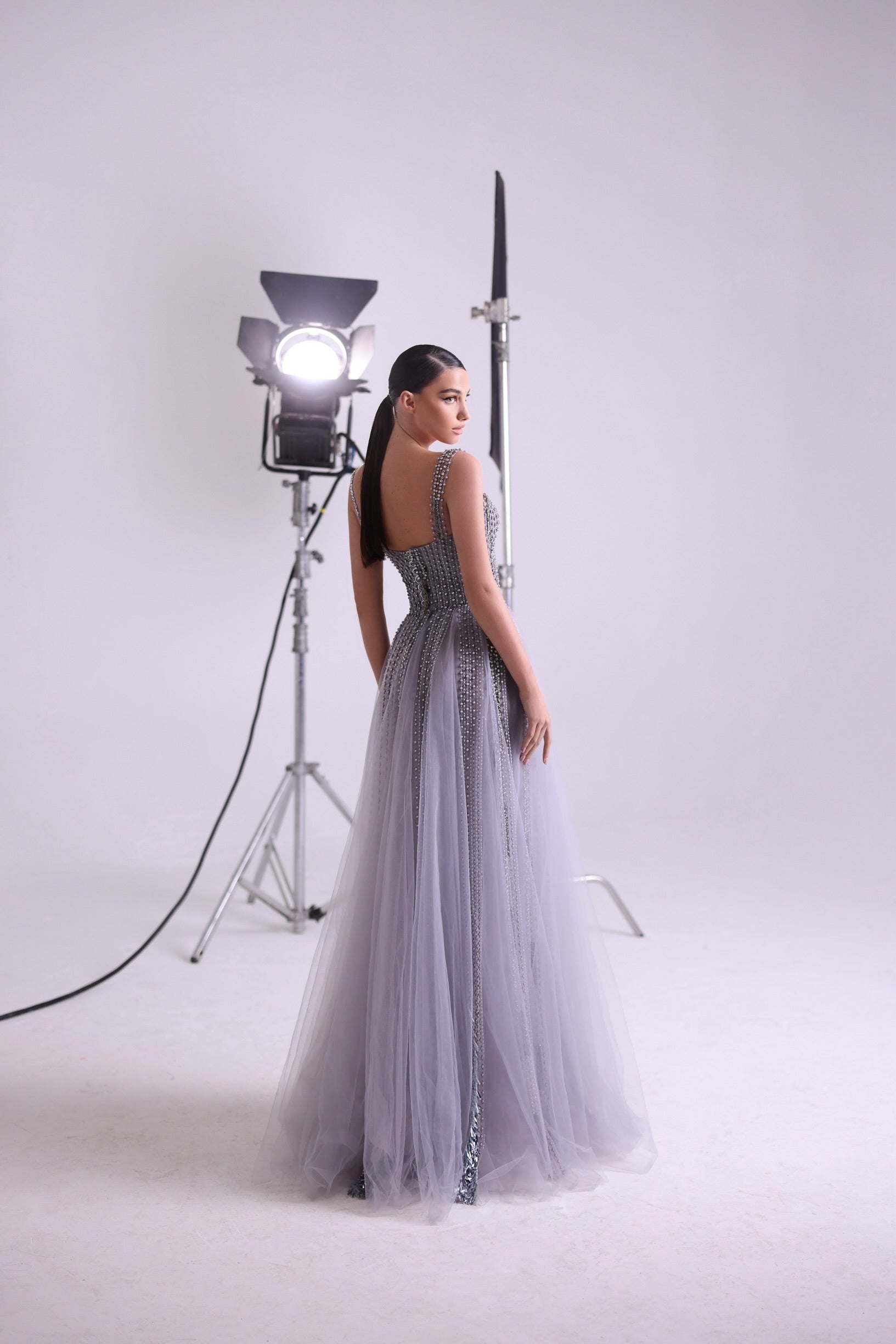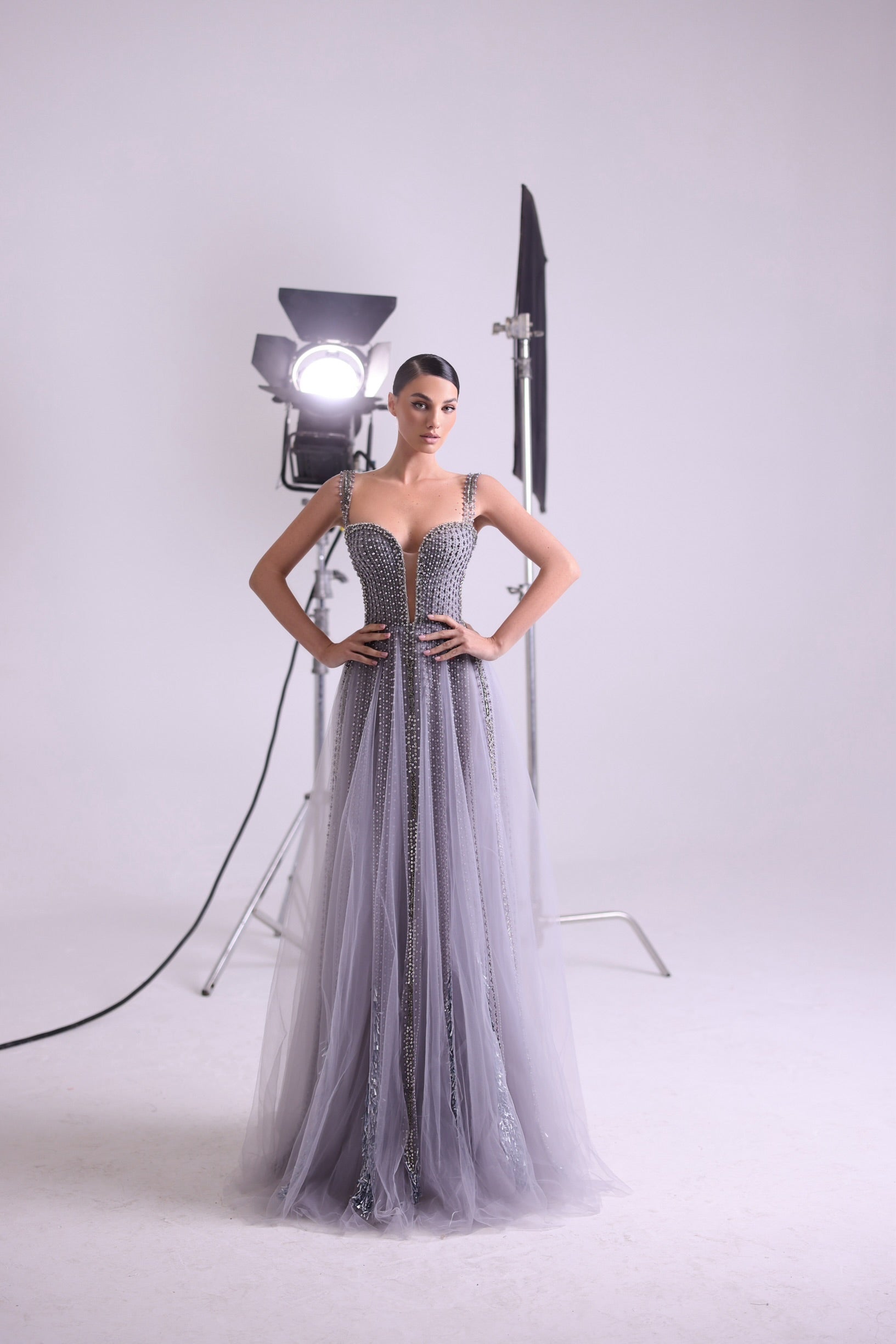 The Tiffany dress is a stunning gray gown adorned with shimmering embellishments that cascade gracefully down the bodice and skirt. Featuring a sweetheart neckline and delicate straps, this A-line gown exudes elegance and timeless beauty, perfect for any sophisticated occasion.