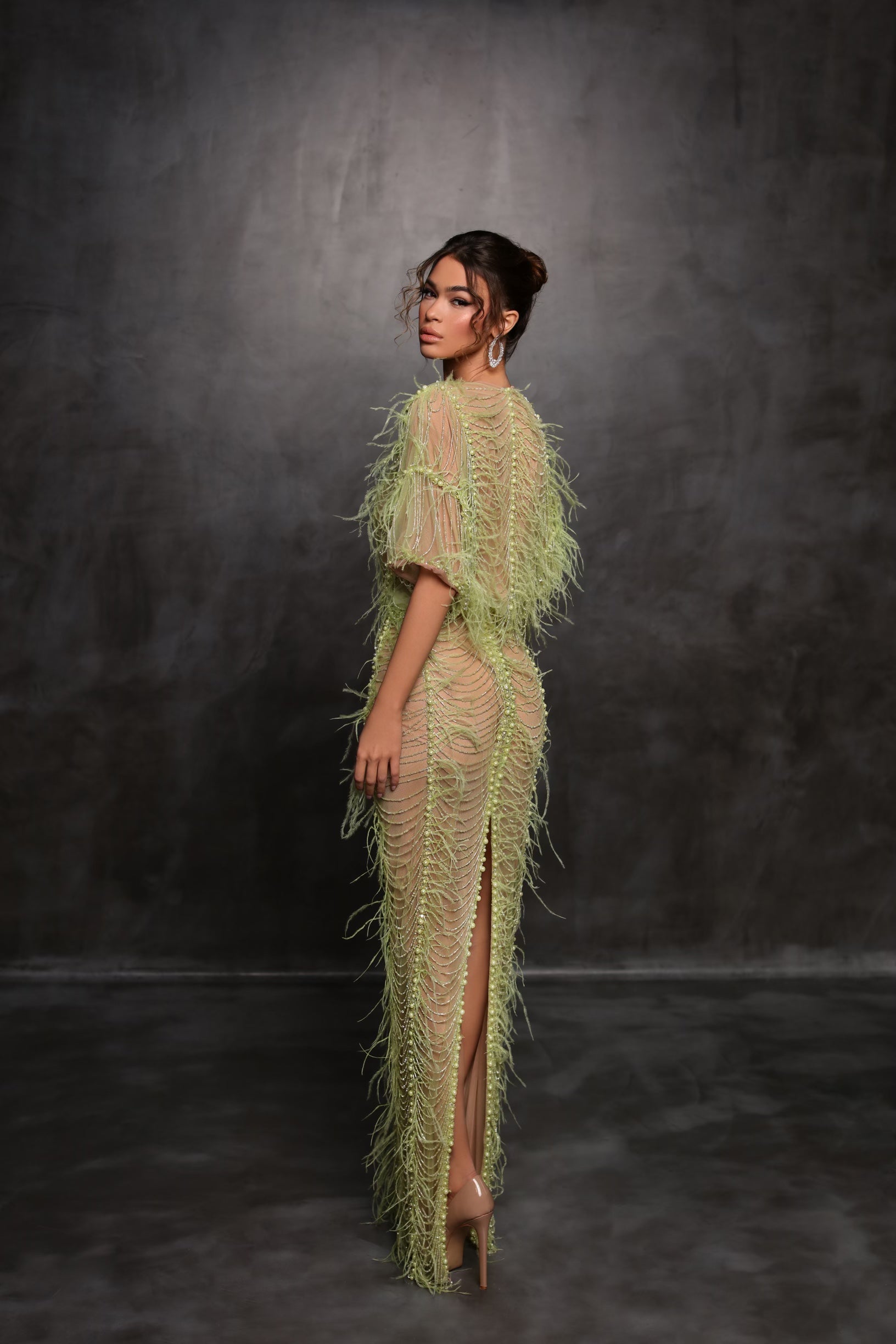 Elegant dress in green with V-neckline, slit back and feather detail.
