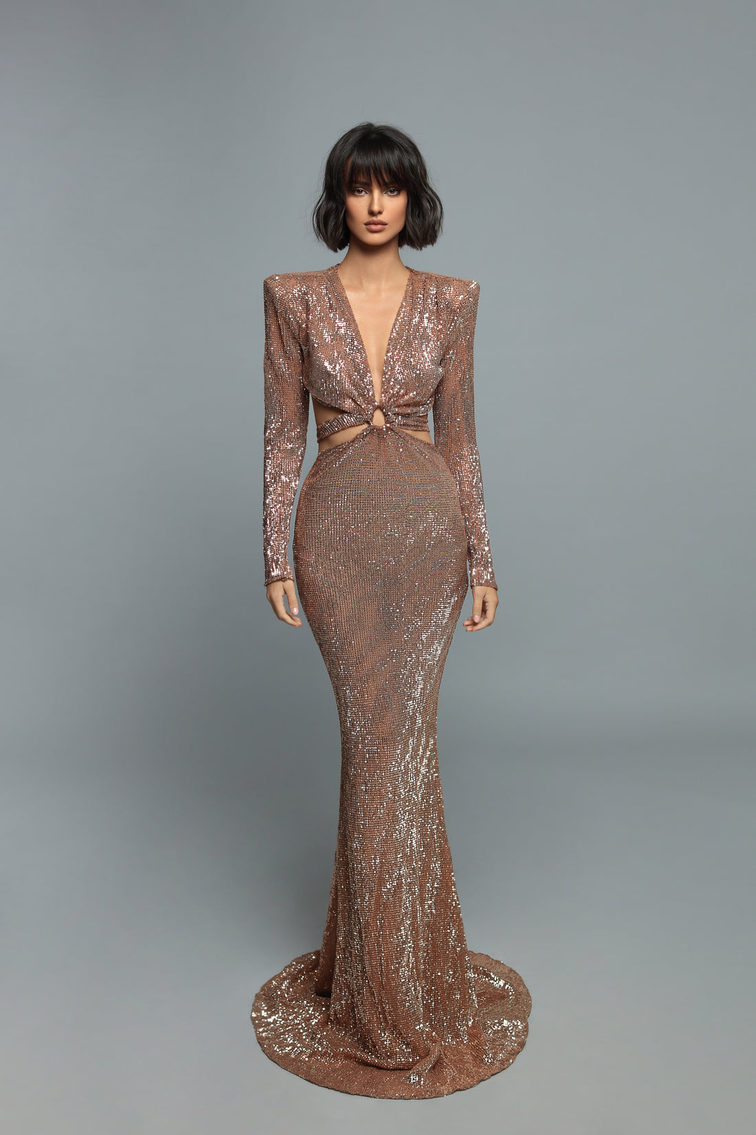 Shining nude sequinned long sleeves gown with V neck and backless.