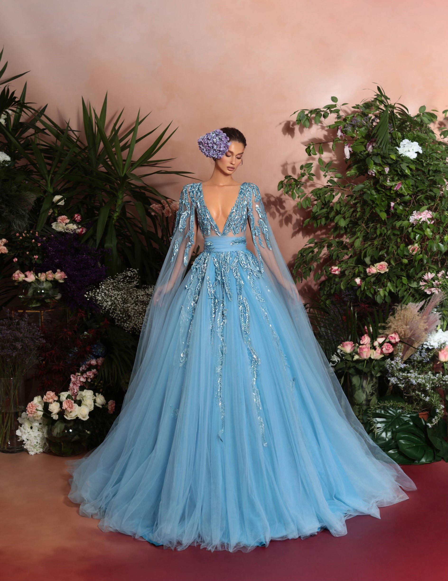 Blue tulle ball dress with long sleveed and handmade shiny beaded details.