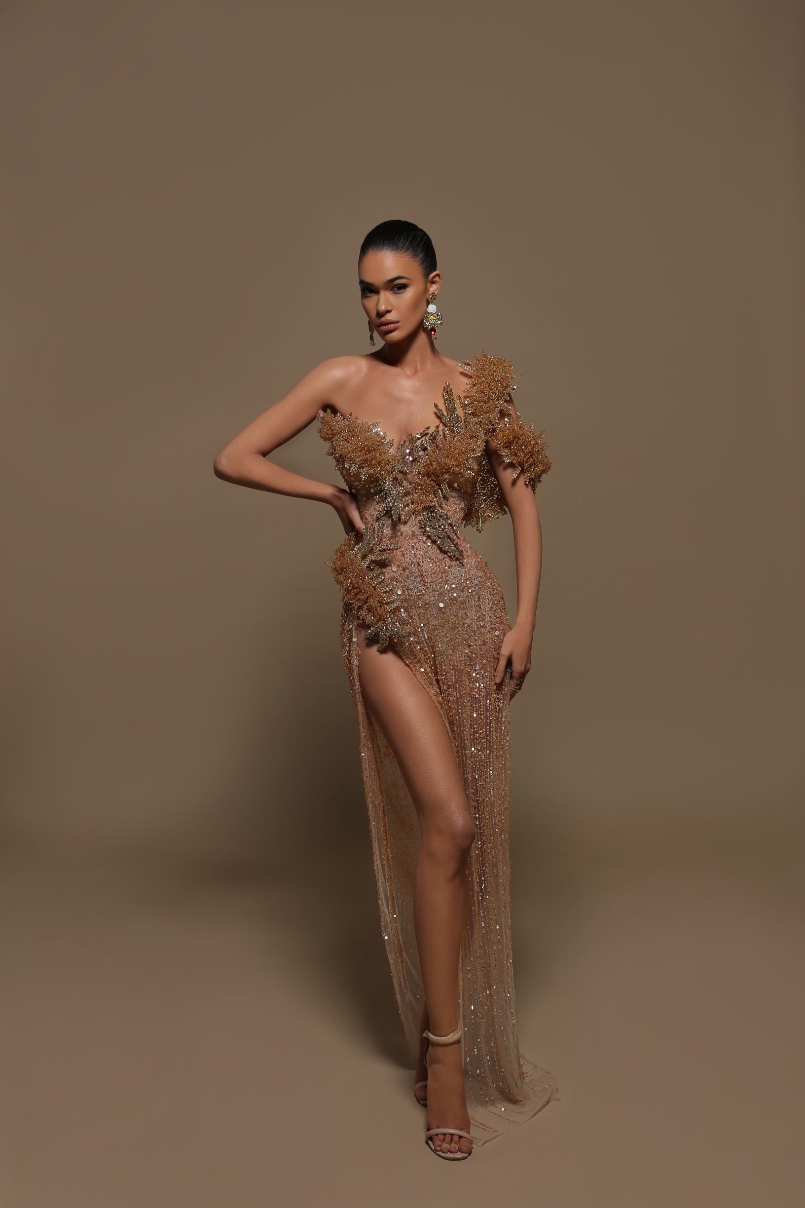 Evening embellished dress one shoulder, detail and high slit.