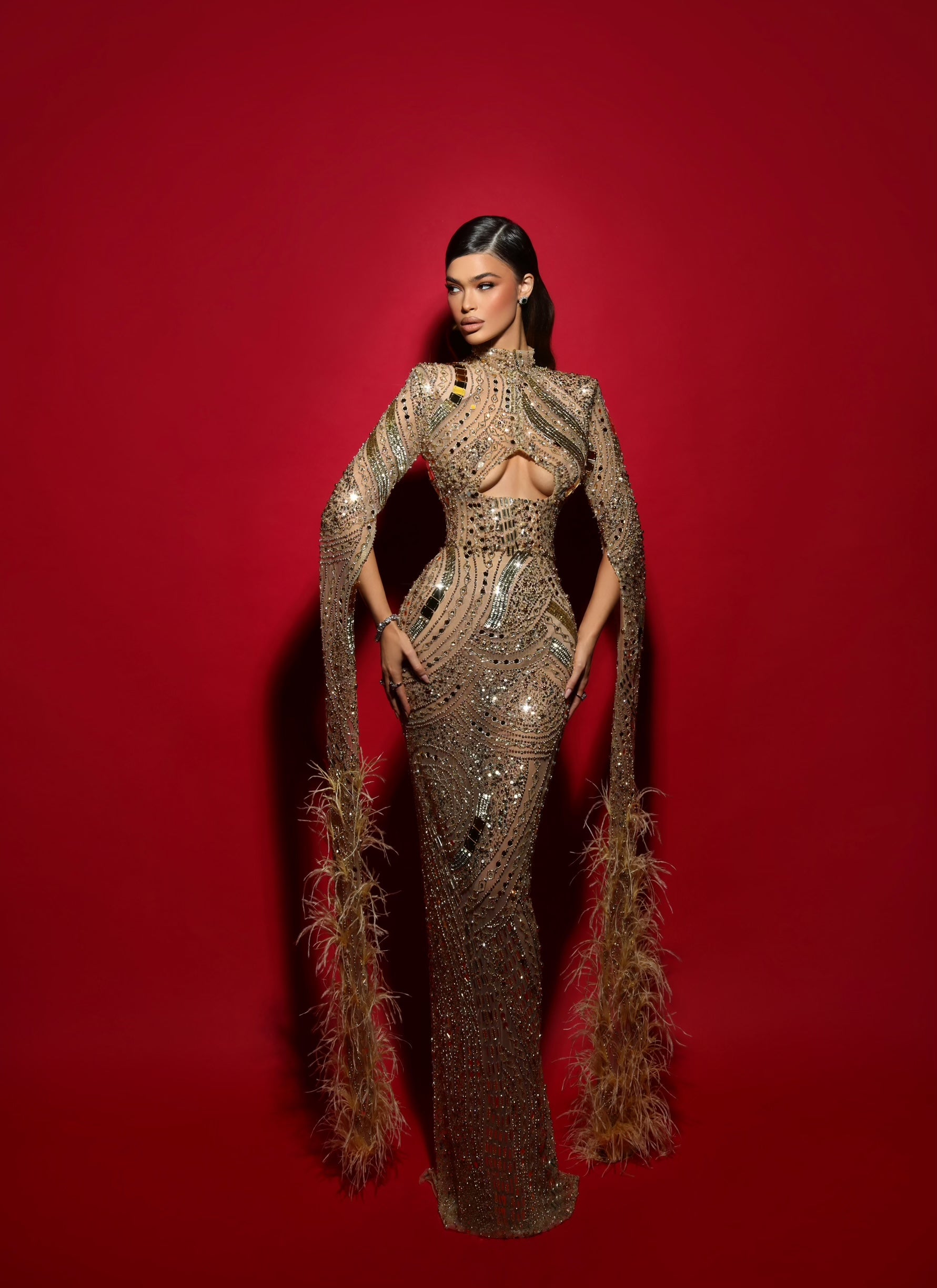 Evening dress with gold beaded, long sleeve with feathers and cut out bust.
